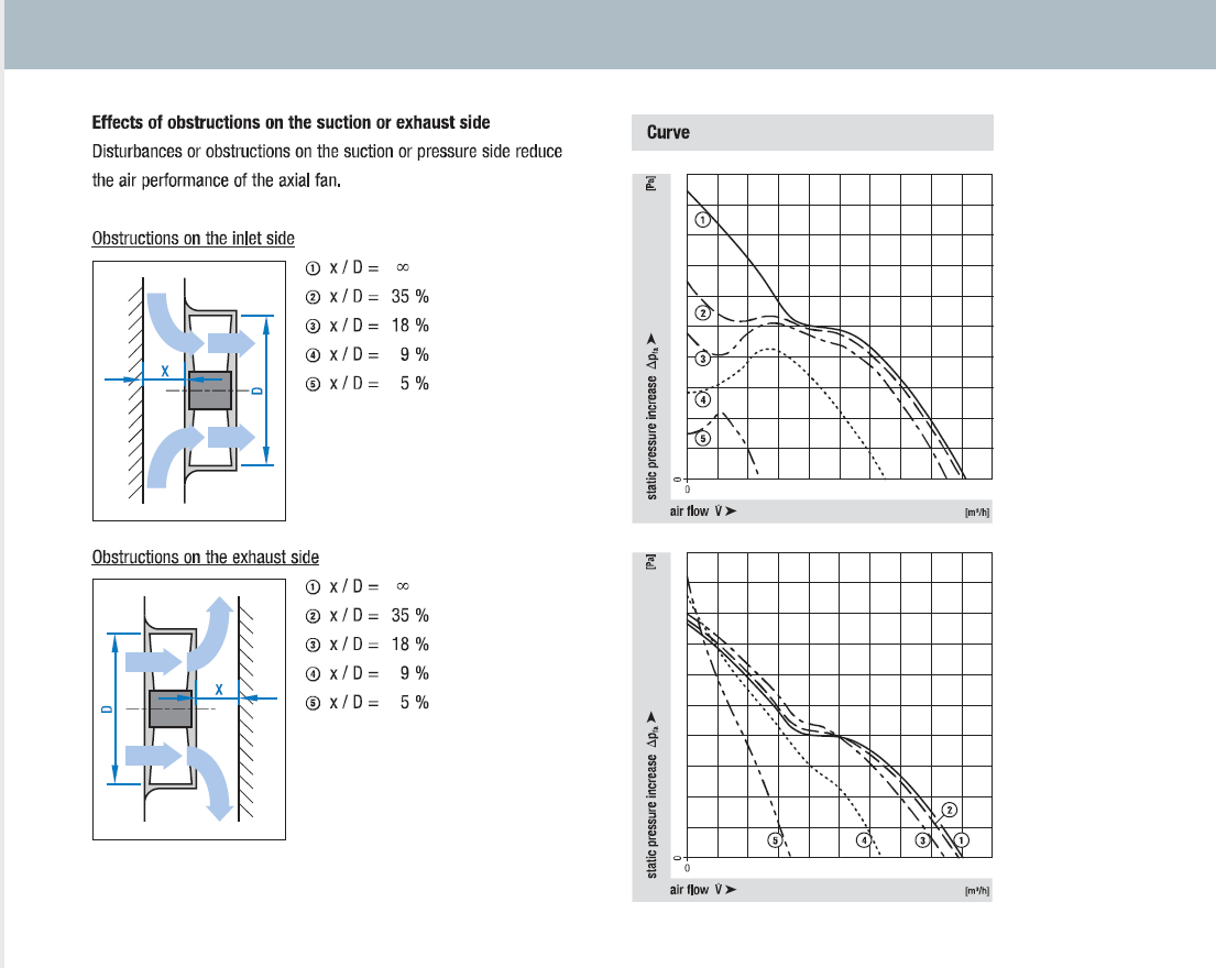 从以上性能图表可以看出,无论是进风口还是出风口,距离障碍物的距离均为叶轮直径的35%以上是最佳