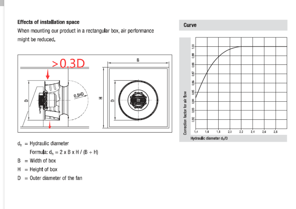 风从叶轮四周甩出,要保证出风侧的风室空间,以便于流畅出风,所以出风侧要求:叶轮边缘离障碍物的距离不低于0.3倍叶轮直径
