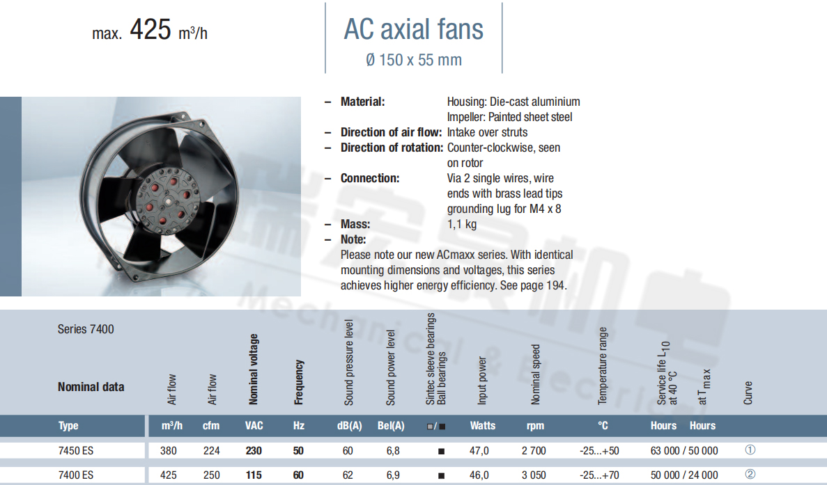 7450ES风量:380m³/h 电压:230v 电流:6.8A 功率:47W 转速:2700r/min